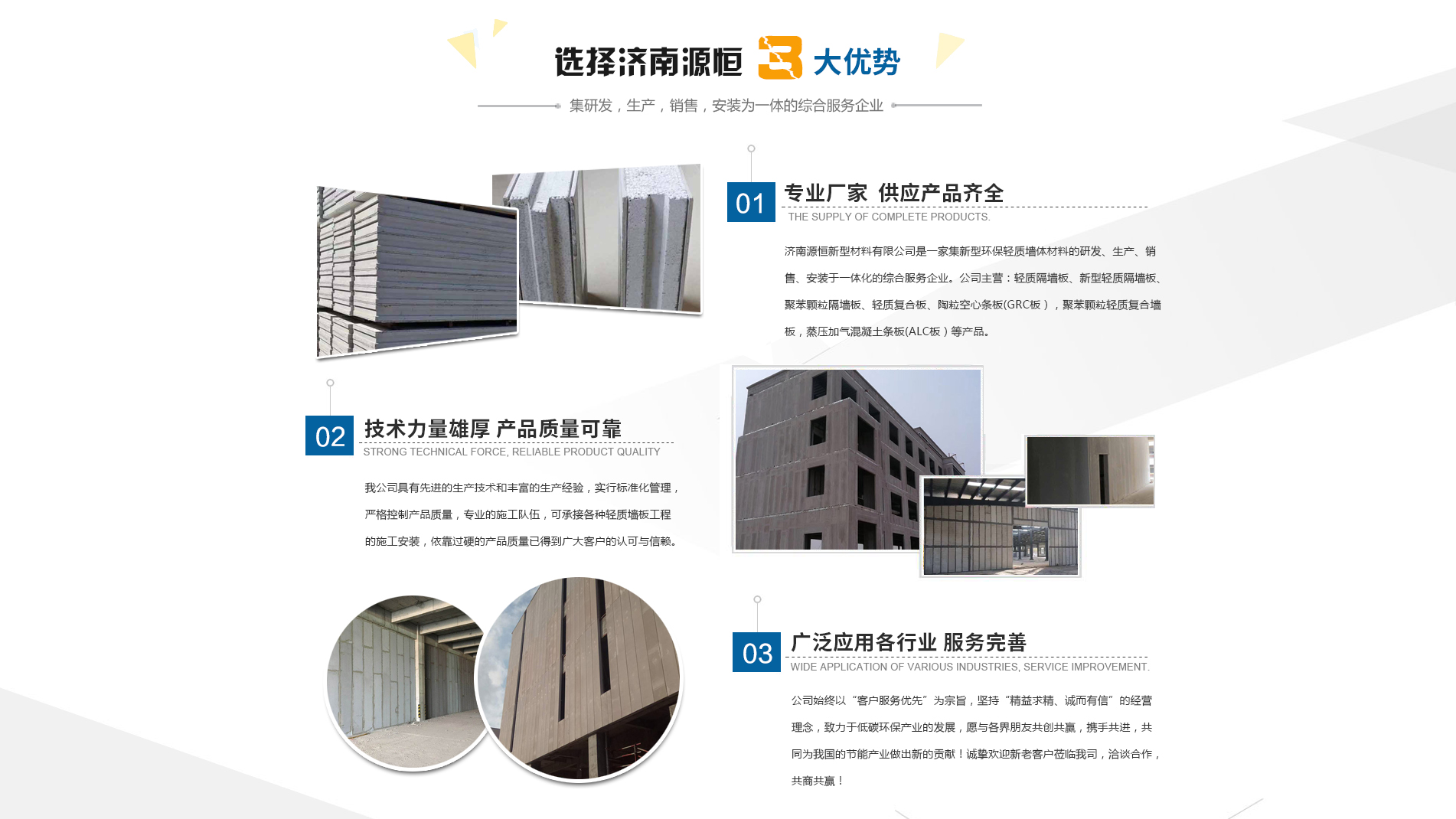 濟南源恒新型材料有限公司坐落于美麗的泉城濟南,是集新型環(huán)保輕質墻體材料的研發(fā)、生產、銷售、安裝于一體化的綜合服務企業。我公司具有的生產技術和豐富的生產經驗,為您提供輕質隔墻板、新型輕質隔墻板、聚苯顆粒隔墻板、輕質復合板、陶粒空心條板(GRC板),聚苯顆粒輕質復合墻板,蒸壓加氣混凝土條板(ALC板)等產品,本公司有專的施工隊伍,可承接各種輕質墻板工程的施工安裝。輕質隔墻板是國家推廣使用的新型輕質、綠色無害建材,是墻改節(jié)能政策大力扶持的環(huán)保節(jié)能產品,是發(fā)達國家普遍采用的新型墻體材料。濟南源恒新型材料有限公司實行標準化管理,嚴格控制產品質量,依靠過硬的產品質量已得到廣大客戶的認可與信賴。公司產品遍布各大城市,與國內多家客戶建立了良好的合作關系。公司始終以“客戶服務優(yōu)先”為宗旨,堅持“精益求精、誠而有信”的經營理念,致力于低碳環(huán)保產業的發(fā)展,愿與各界朋友共創(chuàng)共贏,攜手共進,共同為我國的節(jié)能產業做出新的...